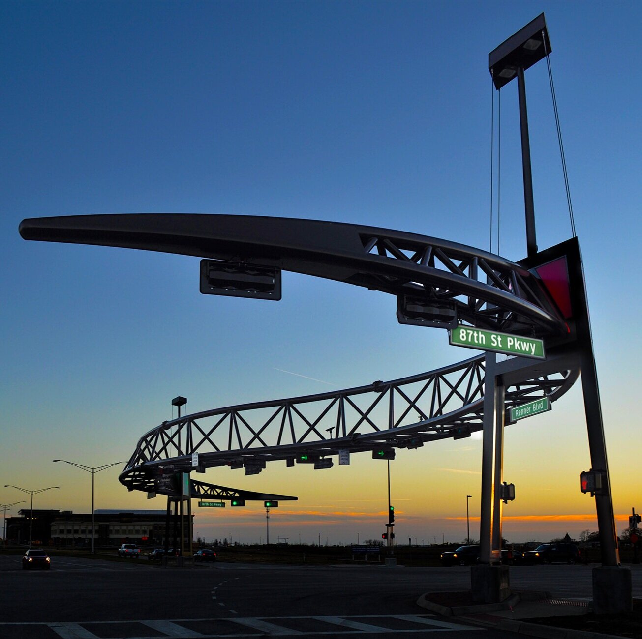 The firm developed schematic designs for the metro’s first Single Point Urban Interchange (SPUI) in just two weeks, while leading the City of Lenexa’s executive team through a theme definition exercise which culminated the “high-tech, environmental” identity. This process created a baseline that informed and unified the design. The truss design led to all associated projects, including the spillway, park shelters, and facilities.